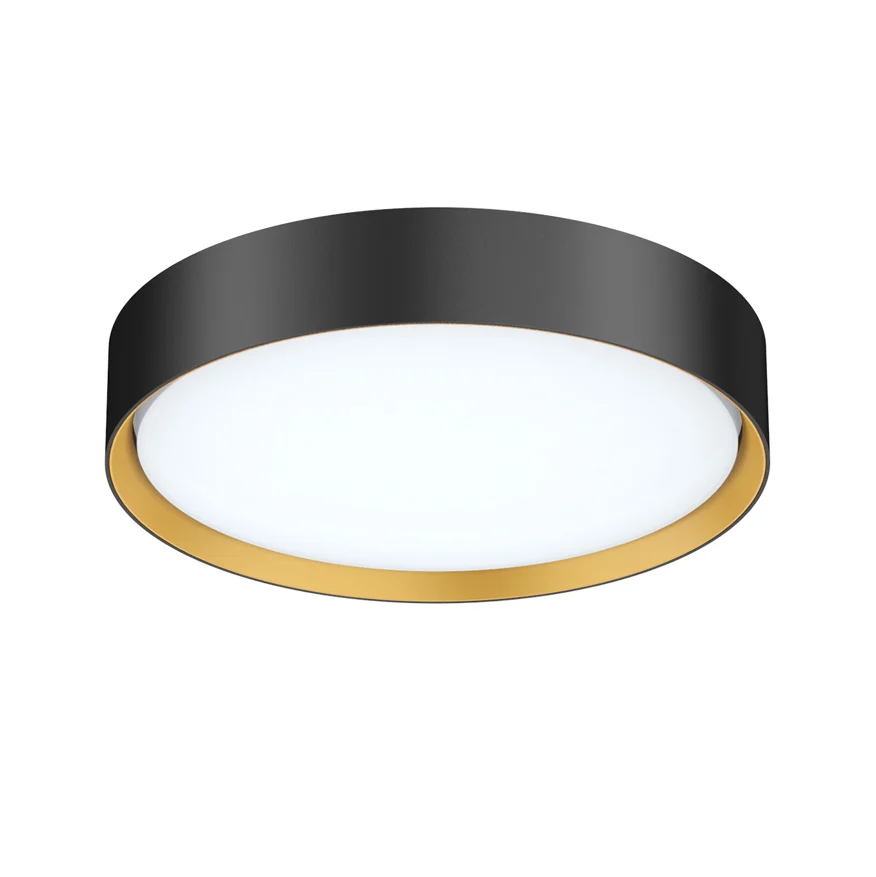 Elegante LED-Anbauleuchte mit 30W Leistung und einstellbarer Lichtfarbe. Schwarzes Aluminiumgehäuse mit einem stilvollen goldenen Innenrand sorgt für ein modernes, edles Design. Dank IP44-Schutz und Triac-Dimmung ideal für vielseitige Innenanwendungen.